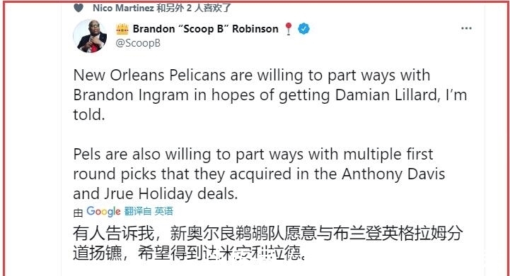 布兰登·罗宾逊在社交媒体 Dao 上写道:有人告诉我,如果新奥尔良鹈鹕队有任何希望得到利拉德,那么他们愿意将英格拉姆送走。同时,他们还将送出一些首轮选秀权,这些选秀权来自安东尼戴维斯和朱霍利迪之前的交易。
